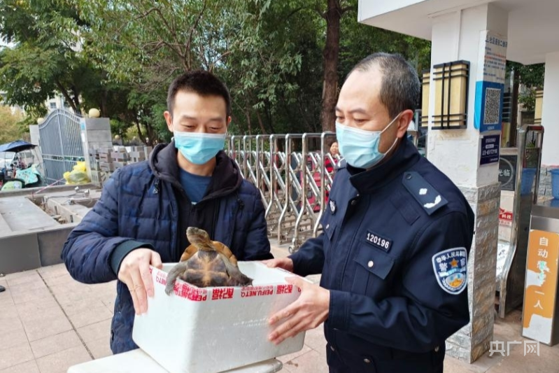 “警察同志您好,我這兒撿了一只烏龜,上網(wǎng)查了一下應(yīng)該是國家二級保護(hù)動(dòng)物,麻煩你們幫忙看看?!?2月4日,群眾魏先生將撿到的一只烏龜交到了重慶高新區(qū)公安分局食藥環(huán)偵支隊(duì)民警的手中。