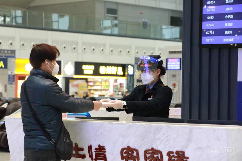 贛州西站服務(wù)臺(tái)為旅客提供口罩(央廣網(wǎng)發(fā) 鄒陽 攝)