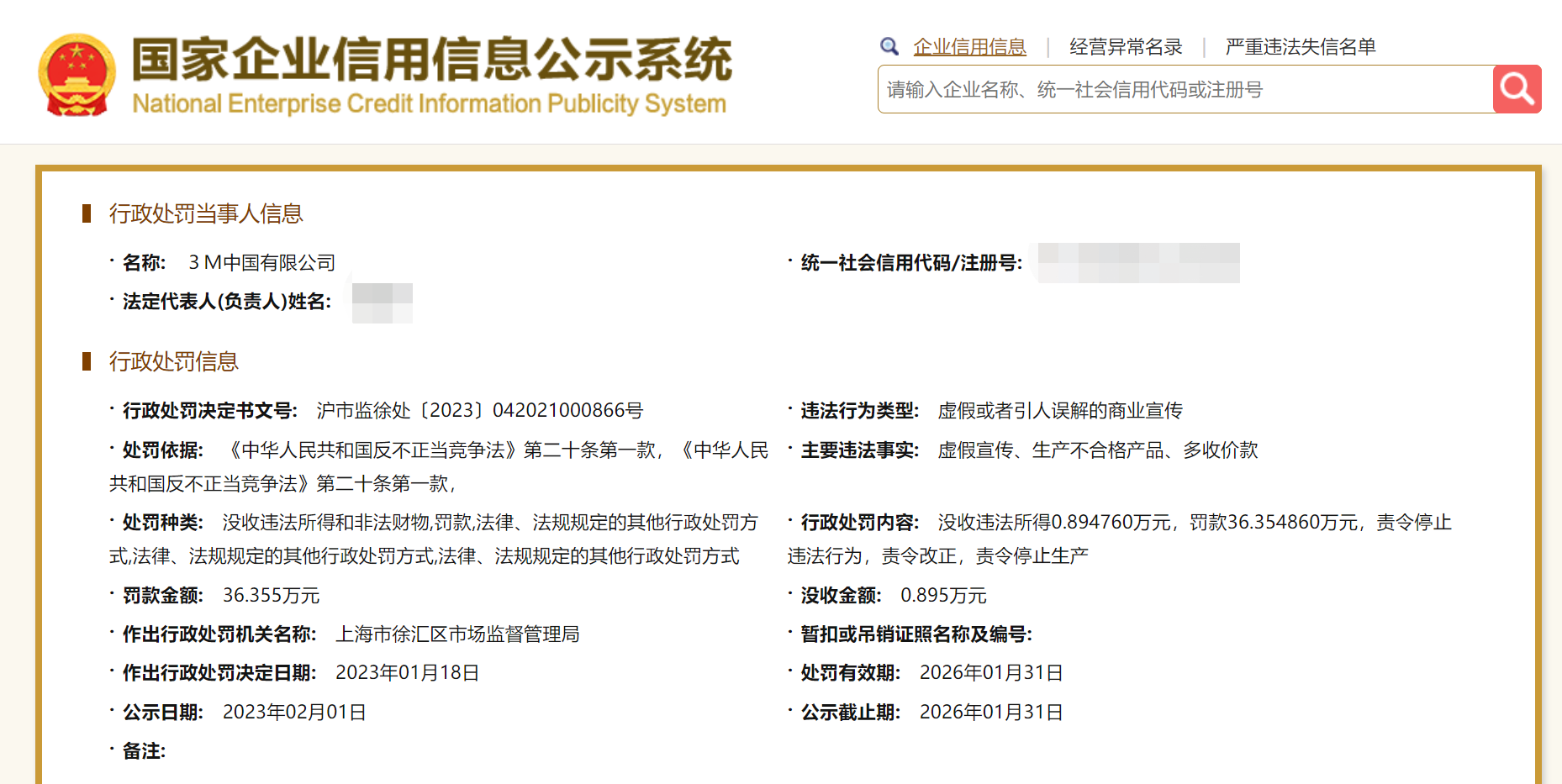 行政處罰信息顯示,3M中國主要違法事實為虛假宣傳、生產(chǎn)不合格產(chǎn)品、多收價款。