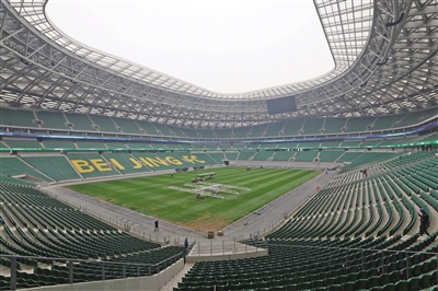 走進(jìn)新工體項(xiàng)目區(qū)域,清灰色外立面的工人體育場(chǎng)在陽(yáng)光下熠熠生輝,綠茵賽場(chǎng)整裝待發(fā),看臺(tái)上環(huán)繞著寫有“北京國(guó)安”的綠色燈條。