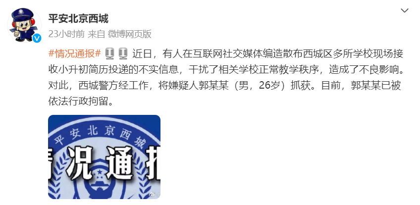 北京西城警方辟謠“多?,F(xiàn)場接收小升初簡歷”