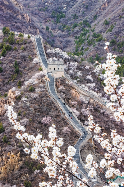 3月24日,居庸關(guān)長(zhǎng)城與山花爛漫同框。新京報(bào)記者 王子誠(chéng) 攝
