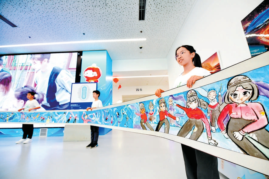 府學胡同小學的同學在“冰絲帶”展示了自己參與實踐課程后,運用所學知識繪制的長卷。本報記者 和冠欣攝