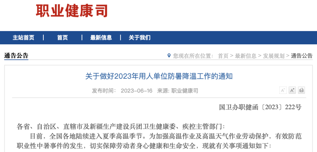 通知指出,目前,全國各地陸續(xù)進(jìn)入夏季高溫季節(jié)。近年來,夏季高溫作業(yè)及高溫天氣作業(yè)導(dǎo)致勞動者中暑死亡的事件時有發(fā)生,對勞動者身心健康和生命安全造成嚴(yán)重威脅。各級衛(wèi)生健康行政部門和疾控主管部門要進(jìn)一步明確工作責(zé)任,加強(qiáng)組織領(lǐng)導(dǎo),系統(tǒng)謀劃部署,協(xié)同推進(jìn)用人單位防暑降溫工作和各項(xiàng)職業(yè)病預(yù)防工作。