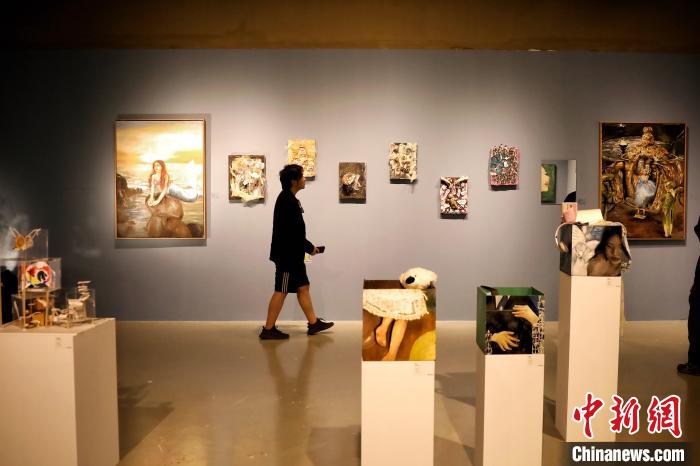 6月底,于飛在北京舉辦個(gè)人藝術(shù)展“啟程”。圖為于飛向觀眾介紹展出作品。 中新社記者 李雪峰 攝