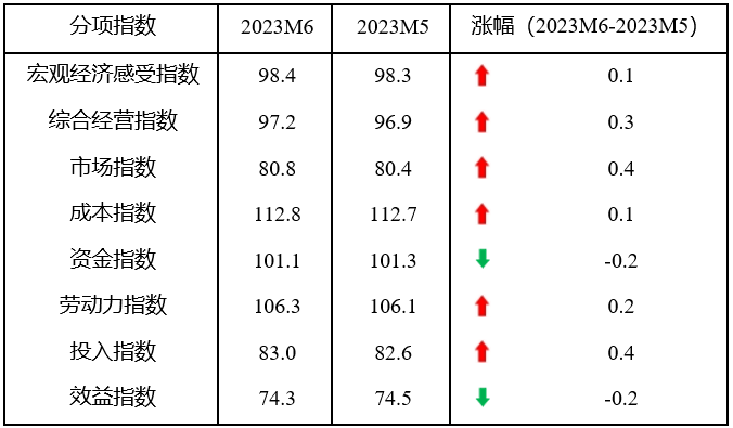 從分項(xiàng)指數(shù)看,6月份,8個(gè)分項(xiàng)指數(shù)6升2降,宏觀經(jīng)濟(jì)感受指數(shù)、市場(chǎng)指數(shù)、成本指數(shù)和投入指數(shù)止跌回升,綜合經(jīng)營(yíng)指數(shù)由平轉(zhuǎn)升,勞動(dòng)力指數(shù)連續(xù)兩個(gè)月上升,資金指數(shù)和效益指數(shù)由升或平轉(zhuǎn)降。