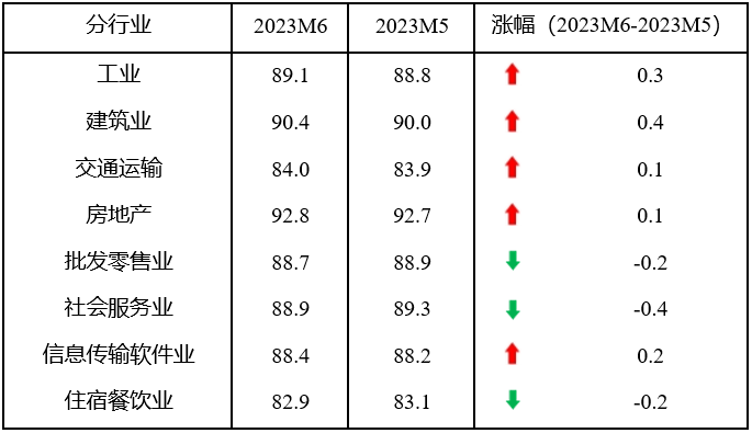 具體來(lái)看,6月份,8個(gè)分行業(yè)指數(shù)5升3降,工業(yè)、建筑業(yè)、交通運(yùn)輸郵政倉(cāng)儲(chǔ)業(yè)、房地產(chǎn)業(yè)和信息傳輸計(jì)算機(jī)服務(wù)軟件業(yè)指數(shù)分別上升0.3、0.4、0.1、0.1和0.2點(diǎn),而批發(fā)零售業(yè)、社會(huì)服務(wù)業(yè)和住宿餐飲業(yè)指數(shù)分別下降0.2、0.4和0.2點(diǎn)。由此可見(jiàn),工業(yè)和建筑業(yè)指數(shù)開(kāi)始回升;而服務(wù)業(yè)指數(shù)的上漲勢(shì)頭出現(xiàn)回調(diào)。