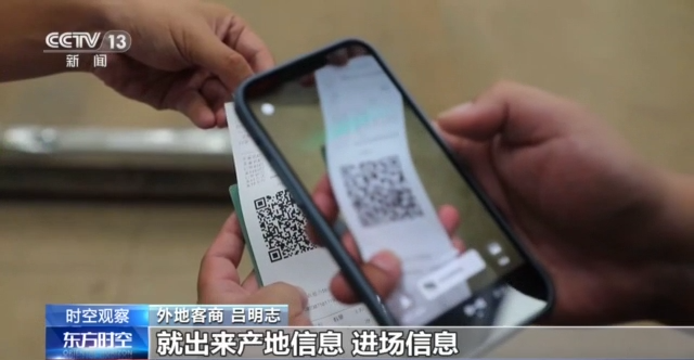 外地客商 呂明志:通過一卡通消費(fèi)了之后,掃上邊這個(gè)追溯碼,就出來產(chǎn)地信息、進(jìn)場(chǎng)信息、檢測(cè)信息,還有采摘時(shí)間,所以說現(xiàn)在很方便,比較安全。
