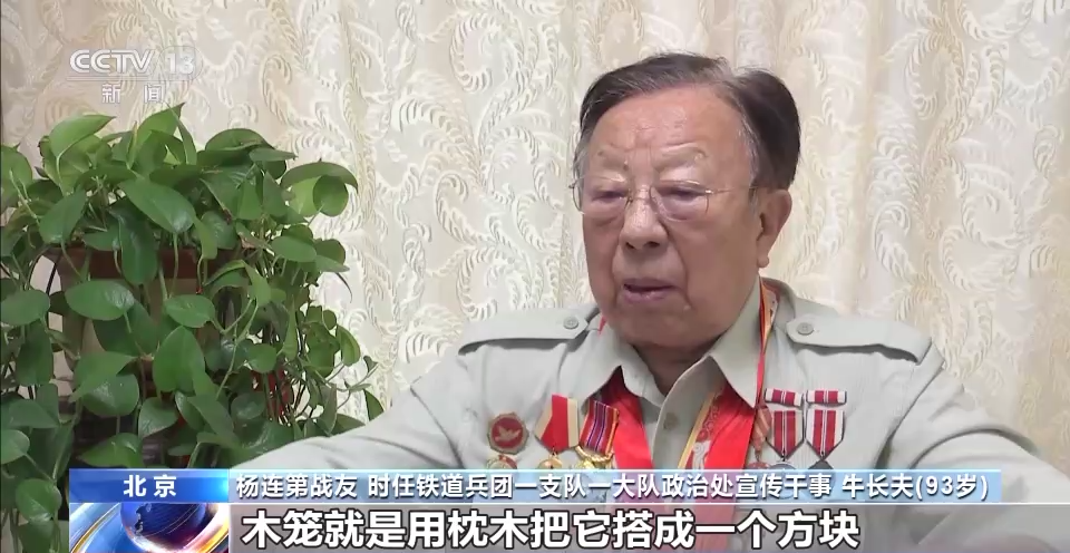 楊連第戰(zhàn)友 時(shí)任鐵道兵一支隊(duì)一大隊(duì)政治處宣傳文化干事 牛長(zhǎng)夫:當(dāng)時(shí)給把橋梁炸毀了,我們上哪弄梁去,楊連第(想了)一個(gè)很絕妙的辦法,就是木籠加木排。木籠就是用的枕木把它搭成一個(gè)方塊,里面投上石頭,作為橋梁的基礎(chǔ),上面再架排架,扣上鋼軌,這樣就可以維持通車了。楊連第一個(gè)多星期,就在水里面泡著。