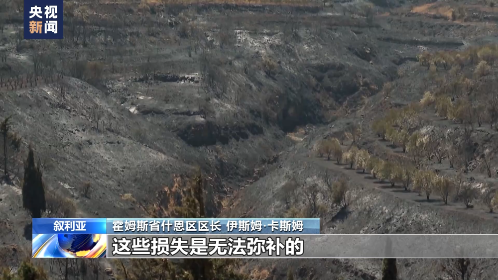 霍姆斯省什恩區(qū)區(qū)長(zhǎng) 伊斯姆·卡斯姆:大火蔓延了約430平方公里,這里種植了橄欖、蘋果、葡萄、無花果樹等,損失非常巨大。我們可以看到橄欖樹都被燒焦了,果農(nóng)損失了大概20年的橄欖產(chǎn)量,這個(gè)地區(qū)往年能產(chǎn)出約1.6萬升的橄欖油,約1.6萬升的蘋果醋,還有蘋果都能出口到鄰國(guó)。今年我們將面臨橄欖油和蘋果產(chǎn)量降低,這些損失是無法彌補(bǔ)的。
