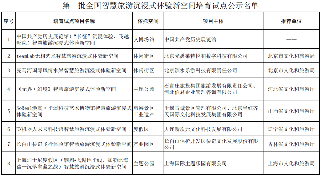 名單顯示,中國共產(chǎn)黨歷史展覽館(“長征”沉浸體驗、飛越影院)智慧旅游沉浸式體驗新空間、teamLab無相藝術(shù)智慧旅游沉浸式體驗新空間、亮馬河國際風情水岸智慧旅游沉浸式體驗新空間等24個項目在列。