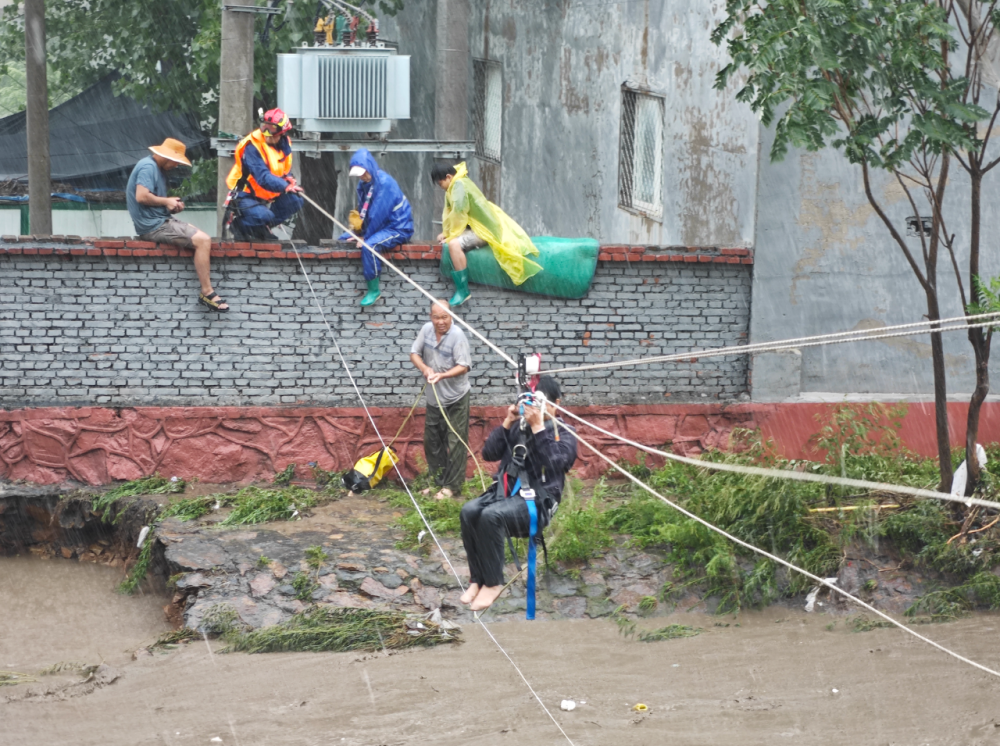 隨后,消防救援人員又來到距離此處約50米的第二處現(xiàn)場(chǎng)。在一個(gè)院子里,有16人被困,包括1名87歲老人和2名3歲兒童。消防救援人員搭設(shè)繩索通道,協(xié)助有行動(dòng)能力的群眾在消防救援人員幫扶下蹚河轉(zhuǎn)移,同時(shí)對(duì)沒有行動(dòng)能力的老人、兒童采取背負(fù)及橡皮艇救援的方式轉(zhuǎn)移。