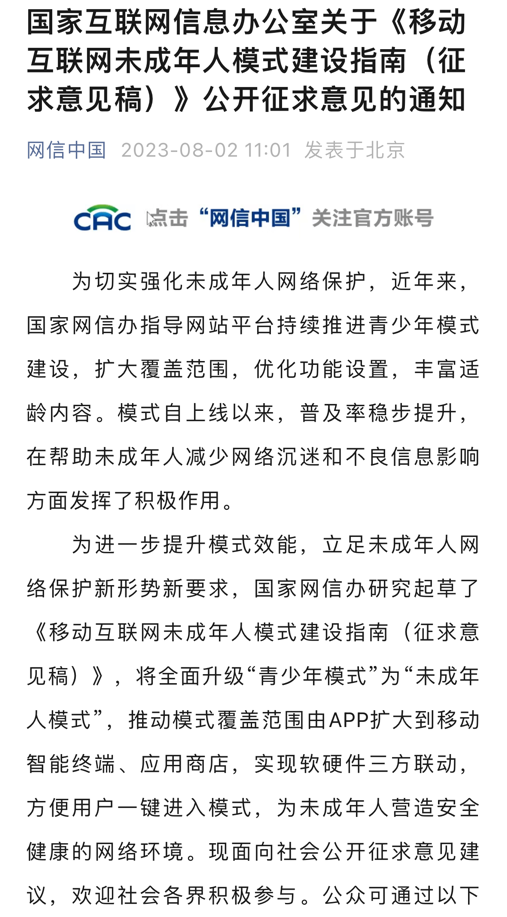 央廣網(wǎng)北京8月3日消息(總臺中國之聲記者馮爍)據(jù)中央廣播電視總臺中國之聲報道,為進(jìn)一步幫助未成年人減少網(wǎng)絡(luò)沉迷和不良信息影響,國家網(wǎng)信辦8月2日發(fā)布了關(guān)于《移動互聯(lián)網(wǎng)未成年人模式建設(shè)指南(征求意見稿)》(以下簡稱《指南》)公開征求意見,將未成年人網(wǎng)絡(luò)保護(hù)的覆蓋范圍由App擴大到移動智能終端、應(yīng)用程序、分發(fā)平臺,把“青少年模式”升級為“未成年人模式”。相關(guān)部門如何給未成年人網(wǎng)絡(luò)保護(hù)設(shè)置護(hù)欄?