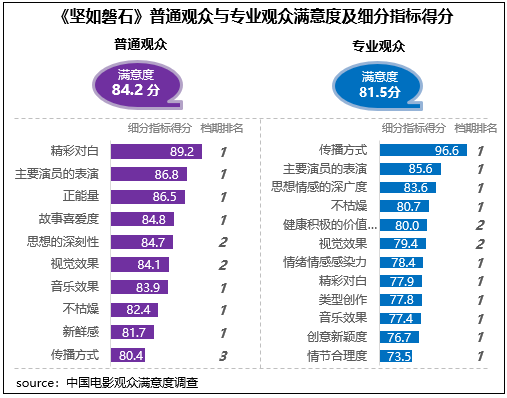 張藝謀導(dǎo)演新作《堅如磐石》獲得觀眾滿意度評分84.1分,居2023年國慶檔調(diào)查五部影片首位,作為聚焦反腐反黑的警匪題材影片,對于社會現(xiàn)實以及人性的描摹深度和豐富層次得到了觀眾的高度好評,思想性得分85.4分,為三大指數(shù)中最高,觀賞性得分84.4分,為檔期最高分,其中主要演員的表演得到了不同觀眾的高度評價,在2023年調(diào)查的50部影片中分別居普通觀眾評價的第6位和專業(yè)觀眾評價的第3位。