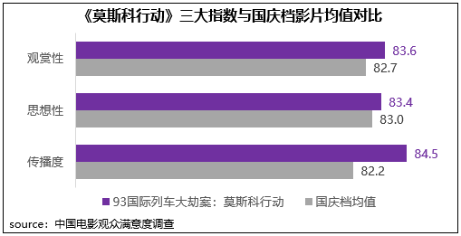 《莫斯科行動》根據(jù)20世紀(jì)90年代跨境追捕搶劫案犯案件改編,在真實社會事件基礎(chǔ)之上有機(jī)融入商業(yè)化要素,三大指數(shù)得分均超83分。