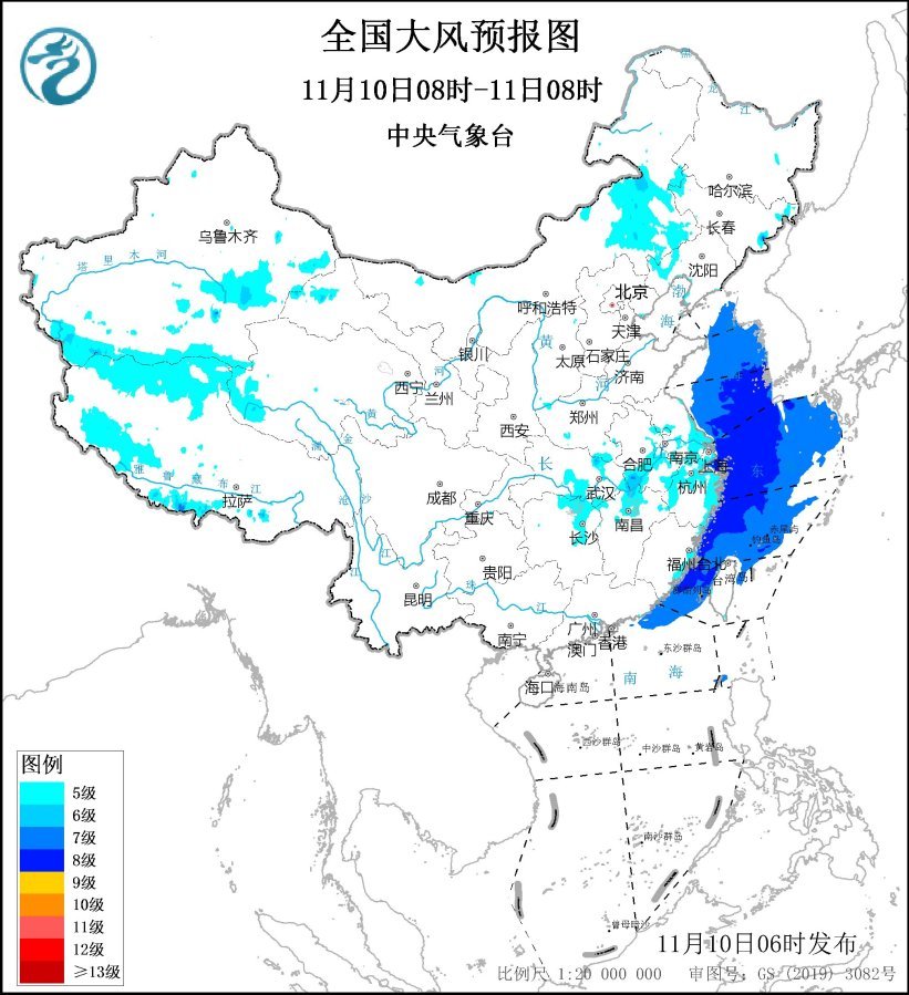 預(yù)計,11月10日08時至11日08時,內(nèi)蒙古中東部、遼寧西部、安徽中南部、河南南部、江蘇南部、上海、湖北南部、湖南東北部、江西北部、浙江北部及東部沿海、福建沿海、臺灣島沿海等地有5~6級、陣風(fēng)7~8級的大風(fēng);黃海大部海域、東海大部海域、臺灣海峽、臺灣以東洋面偏北海域、南海東北部偏北海域?qū)⒂?~8級、陣風(fēng)9~10級的大風(fēng)。
