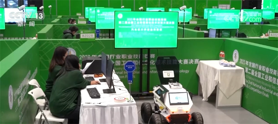 總臺(tái)央視記者 張叢婧:我身旁這一個(gè)個(gè)小隔間就是選手的比賽工位,可以看到有不同顏色,代表著四個(gè)賽項(xiàng),分別是工業(yè)互聯(lián)網(wǎng)安全、汽車芯片開發(fā)應(yīng)用、工業(yè)大數(shù)據(jù)算法、5G+虛擬現(xiàn)實(shí)開發(fā)應(yīng)用。除了工業(yè)大數(shù)據(jù)算法這一項(xiàng),其他三個(gè)賽項(xiàng)都是今年新設(shè)立的。