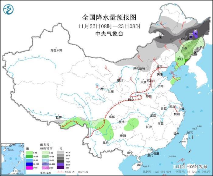 11月22日08時(shí)至23日08時(shí),內(nèi)蒙古中東部、黑龍江大部、吉林、遼寧北部等地部分地區(qū)有小到中雪或雨夾雪,其中,內(nèi)蒙古東部、黑龍江中東部、吉林長白山區(qū)等地部分地區(qū)有大到暴雪,黑龍江中部偏南地區(qū)局地有大暴雪(20~27毫米)。遼寧東部、西藏東南部、四川盆地西南部等地部分地區(qū)有小雨,局地有中雨。西北地區(qū)中部和東北部、內(nèi)蒙古大部、東北地區(qū)大部、華北大部、黃淮西部、山東半島等地部分地區(qū)有4~6級(jí)風(fēng)(見圖7)。