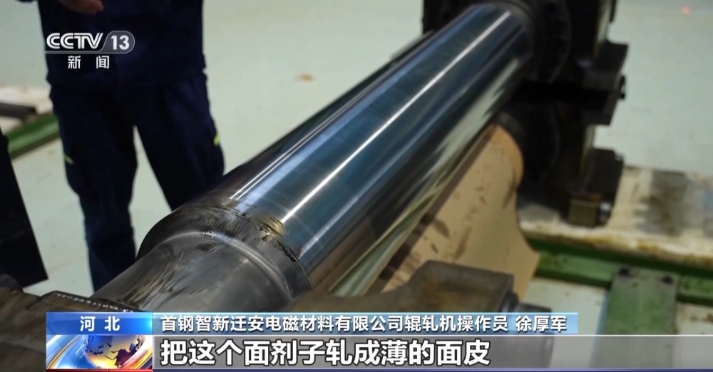 首鋼智新遷安電磁材料有限公司輥軋機(jī)操作員 徐厚軍:這就是軋制和帶鋼直接接觸的工作輥,如果說家里搟面的話,這就是我們的搟面杖。那個(gè)鋼鐵材料就相當(dāng)于面劑子,我們就用這個(gè)搟面杖,通過擠壓,把這個(gè)面劑子軋成薄的面皮。6個(gè)搟面杖串起來,一遍就軋出來了。生產(chǎn)效率比傳統(tǒng)生產(chǎn)方法高了8倍到10倍,這條機(jī)組軋制速度是1500米每分鐘,相當(dāng)于高速公路上以時(shí)速90公里開的小車一直在跑。