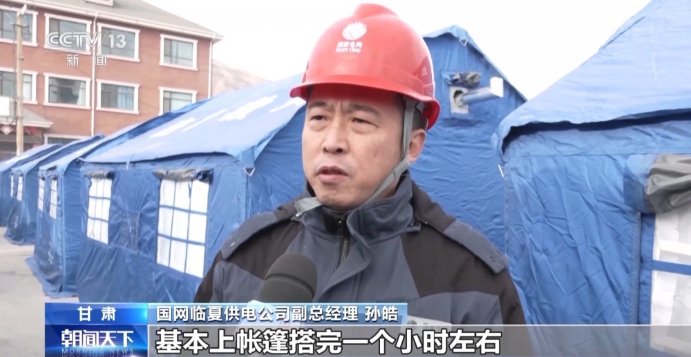 國網臨夏供電公司副總經理 孫皓:基本上帳篷搭完一個小時左右,我們就能把電通上,因為每個點我們都有3到10名工作人員在跟進,充分地調動了我們所有的人員和力量,把這項工作放在最重要的位置上,把老百姓的電先供好。