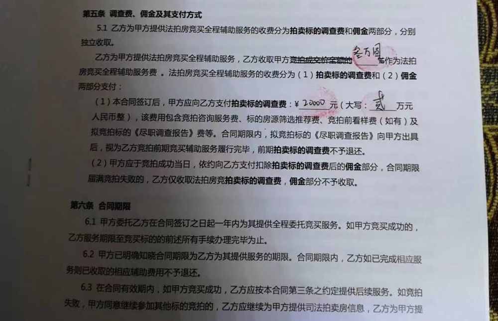 最終,中介口中30萬出頭就可以拿下的房子,被加價(jià)到了39萬,李先生放棄了競(jìng)拍。他算了一筆賬,按最終成交價(jià)再加上各種費(fèi)用,這套法拍房不低于同戶型的二手房?jī)r(jià)格。房子沒拍到,之前交的兩萬元“調(diào)查費(fèi)”也打了水漂。在李先生給記者提供的雙方合同中,有這樣的約定:“合同期限內(nèi),擬競(jìng)拍標(biāo)的《盡職調(diào)查報(bào)告》向甲方出具后,視為乙方競(jìng)拍前期競(jìng)買輔助服務(wù)履行完畢,前期拍賣標(biāo)的‘調(diào)查費(fèi)’不予退還”。