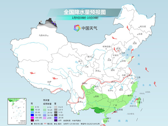 具體來看,今天新疆北疆北部、山東半島等地有小到中雪或雨夾雪,其中新疆阿勒泰、塔城的部分地區(qū)有大到暴雪,局地大暴雪(20~24毫米);四川盆地南部、貴州、江南南部和東部、華南、臺灣島等地有小雨,其中廣西南部等地的部分地區(qū)有中雨。
