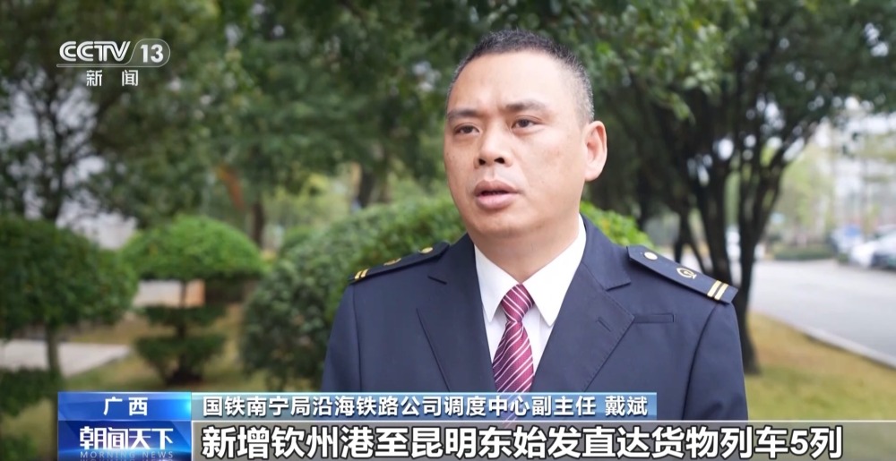 國鐵南寧局沿海鐵路公司調(diào)度中心副主任 戴斌:新增欽州港至昆明東始發(fā)直達(dá)貨物列車5列,新增防城港至德保、靖西、田東等方向貨物列車4列,不斷延伸西部陸海新通道鐵海聯(lián)運(yùn)班列通達(dá)區(qū)域。