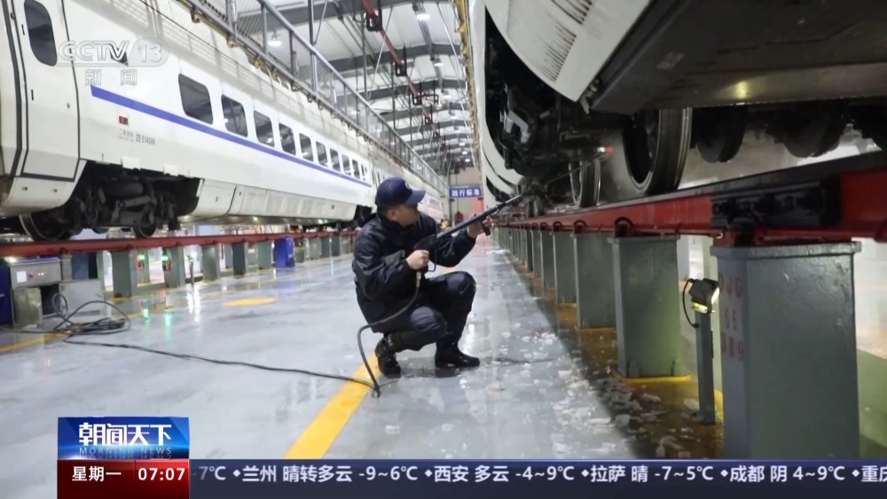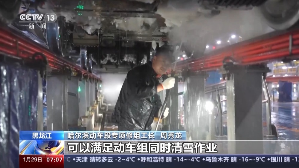 哈爾濱動車段檢修車間副主任 張釗:設備的迭代主要體現在集中適時加熱、恒溫恒壓供水、二次加熱等技術,能夠滿足整列動車組清冰除雪需求。