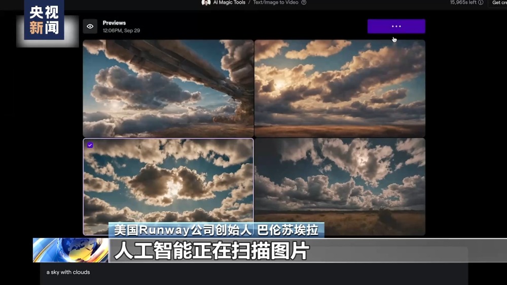美國Runway公司創(chuàng)始人 巴倫蘇埃拉:讓我們做一個有云的天空,我可以選擇電影風(fēng)格或預(yù)覽角度。我真的很喜歡這張,它看起來就像光是從云里出來的。人工智能正在掃描圖片,并由此生成一段視頻。你現(xiàn)在可以看到云正在移動,天空正在變暗,暴風(fēng)雨就要來了。