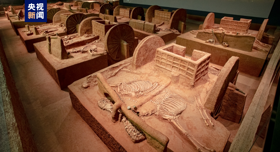 “車轔轔馬蕭蕭”殷墟車馬遺跡展,展廳內(nèi)23座車馬坑遺跡,矩陣式陳列,氣勢震撼。展示了商代裝飾華麗、結(jié)構(gòu)精巧、機(jī)動靈活的馬車,是中國目前所見最早的馬車實(shí)物標(biāo)本,更是對三千多年前商文明的生動詮釋。經(jīng)過近百年探索,殷墟發(fā)掘車馬坑九十余座,再現(xiàn)了商代馬車面貌。馬車不僅作為王室貴族的代步工具,也在驛站傳遞、田獵出行、載兵作戰(zhàn)等方面發(fā)揮著重要作用。殷墟馬車多埋于大型墓葬附近或墓道內(nèi)、以車、馬、人合葬居多。殷墟早期以車馬器陪葬,車馬器套數(shù)代表主人所擁有的馬車數(shù)量,見證著主人身份等級的高低;晚期馬車陪葬成為中、上級貴族的專屬,彰顯著墓主人的赫赫權(quán)威,亦是馬車陪葬制度的萌芽。