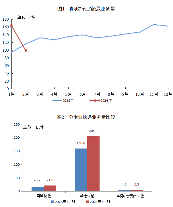 1-2月,同城快遞業(yè)務(wù)量完成21.9億件,同比增長28.3%;異地快遞業(yè)務(wù)量完成205.4億件,同比增長28.5%;國際/港澳臺快遞業(yè)務(wù)量完成5.3億件,同比增長31.9%。