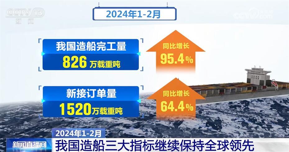 最新數(shù)據(jù)顯示,2024年1—2月,我國(guó)造船完工量826萬(wàn)載重噸,同比增長(zhǎng)95.4%;新接訂單量1520萬(wàn)載重噸,同比增長(zhǎng)64.4%;截至2月底,手持訂單量14919萬(wàn)載重噸,同比增長(zhǎng)31.3%,造船三大指標(biāo)國(guó)際市場(chǎng)份額繼續(xù)全球領(lǐng)先。