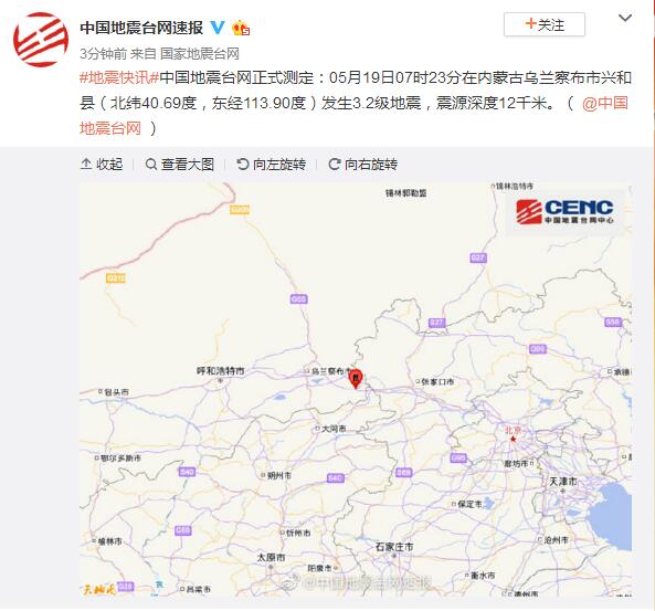 內蒙古烏蘭察布市興和縣發(fā)生3.2級地震 震源深度12千米