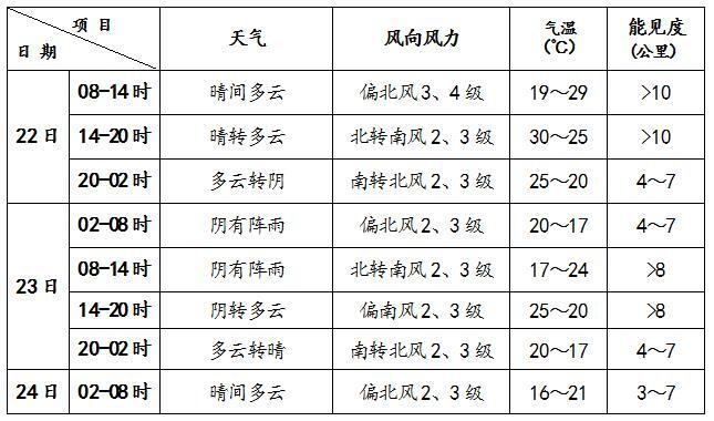預(yù)計(jì)24-28日期間,大部分時(shí)間本市天氣為晴到多云。受弱冷空氣影響,25日有3、4級(jí)偏北風(fēng)。該期間氣溫較為平穩(wěn),白天最高氣溫28~30℃,夜間最低氣溫14~16℃。