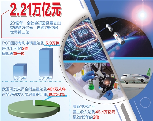 科技創(chuàng)新實力顯著增強。2019年,全社會研發(fā)經費支出達到2.21萬億元,是2015年的1.56倍,連續(xù)7年位居世界第二位,占全球研發(fā)經費總量的比例超過16%。2019年,PCT國際專利申請量達到5.9萬件,是2015年的2倍,躍居世界第一位。2019年,每萬人有效發(fā)明專利擁有量達到13.3件,提前完成國家“十三五”規(guī)劃目標。