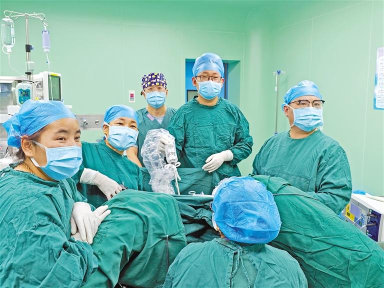 上海援藏醫(yī)療專家隋孟松(右一)帶領(lǐng)本地婦科醫(yī)生開展日喀則市首例腹腔鏡下全子宮切除手術(shù)。