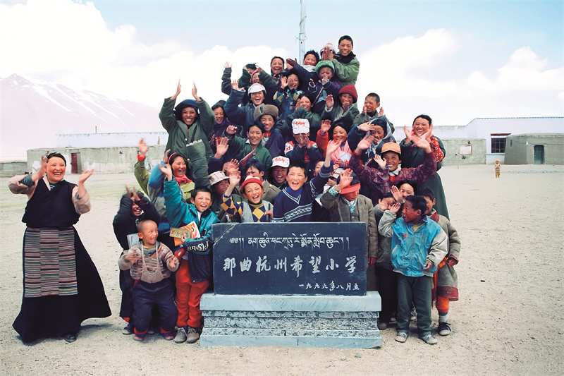 那曲杭州希望小學建成時,老師和學生在石碑前合影留念。那曲市色尼區(qū)委宣傳部供圖
