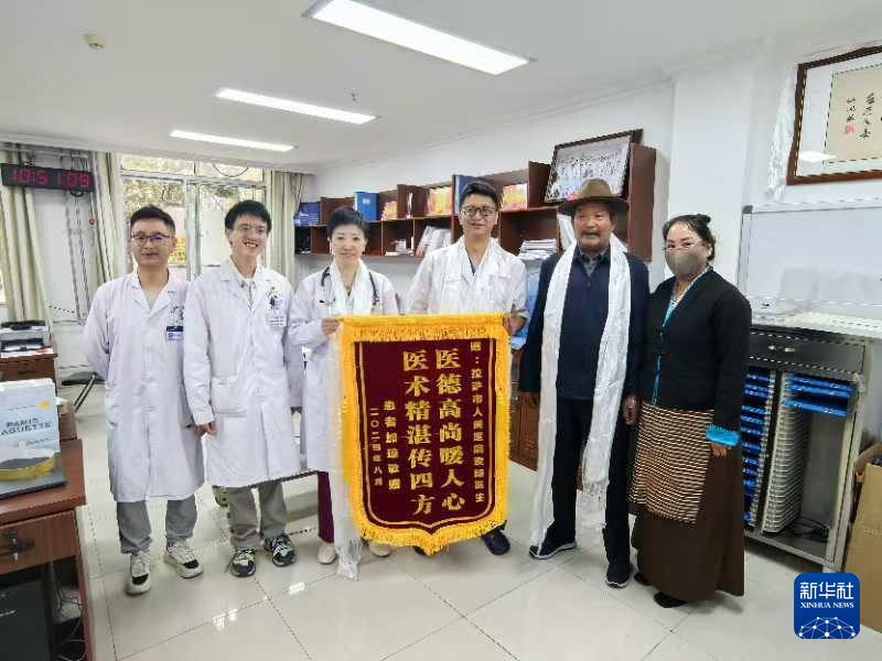 “突切囊,突切囊(非常感謝)。”患者加瓊即將離院之際,特意向主治醫(yī)生索朗和郭麗珠獻(xiàn)上哈達(dá)和錦旗。