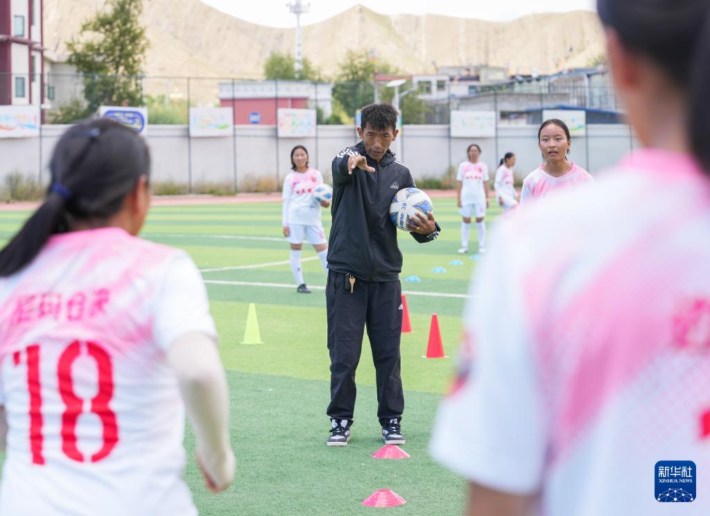 西藏日喀則市上海實驗學(xué)校“珠峰雪鷹”女子足球隊教練洛布桑(中)在操場上指導(dǎo)球員訓(xùn)練(9月3日攝)。