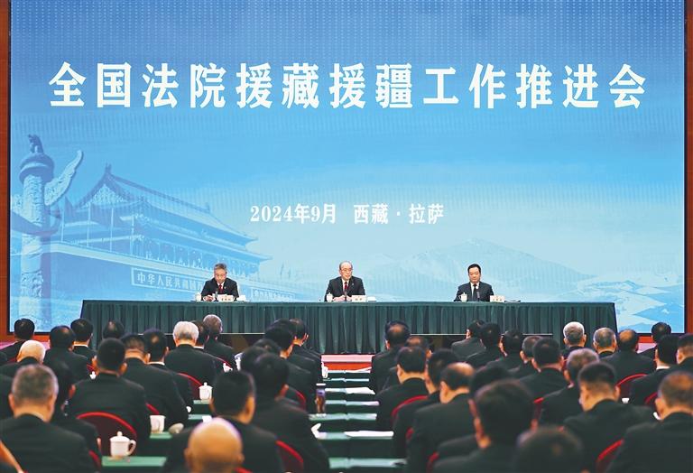 張軍指出,對(duì)口援藏援疆是義不容辭的政治責(zé)任。要從政治和全局高度深刻認(rèn)識(shí)對(duì)口援藏援疆工作的重大意義。要從堅(jiān)定擁護(hù)“兩個(gè)確立”、堅(jiān)決做到“兩個(gè)維護(hù)”的政治高度,從推進(jìn)中國(guó)式現(xiàn)代化的全局高度,切實(shí)增強(qiáng)做好對(duì)口援藏援疆工作的自覺(jué)。要聚焦審判執(zhí)行主責(zé)主業(yè),促推“依法治藏”“依法治疆”落到實(shí)處。要在物資裝備援助、基礎(chǔ)設(shè)施建設(shè)等“顯績(jī)”的基礎(chǔ)上,更加注重做促審判理念、司法能力、精神面貌轉(zhuǎn)變等“潛績(jī)”工作,增強(qiáng)受援法院發(fā)展的內(nèi)生動(dòng)力。