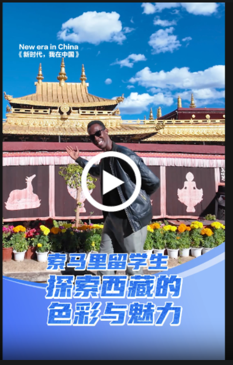 在西藏的藍天白云下,索馬里留學生陽光(Musab Abdikadir)覺得這里的風景宜人、色彩斑斕,令人心馳神往。作為中央民族大學的學生,陽光在中國已生活了八年,初次踏足西藏,他便被這片充滿新鮮感的土地和震撼心靈的美景所打動。