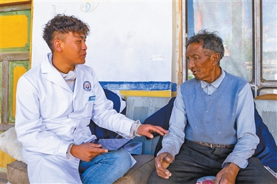 村醫(yī)索朗丹增(左)為村民進(jìn)行健康檢查。徐馭堯 攝