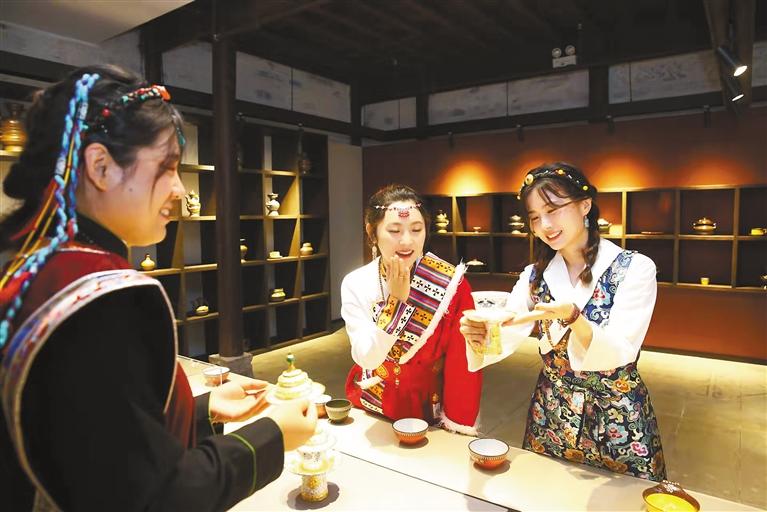 充滿墨竹風(fēng)情的藏式生活館吸引了不少市民與游客,走進(jìn)館內(nèi),整齊陳列的塔巴陶瓷、藏靴、藏式擺件、藏式水果托盤(pán)、唐卡等非物質(zhì)文化遺產(chǎn)作品和文創(chuàng)延伸產(chǎn)品,色彩濃郁、古樸典雅,原汁原味地呈現(xiàn)了藏式民族特色生活中所涵蓋的細(xì)節(jié)。