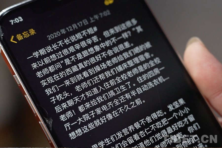 當(dāng)吳穎琦被問到為什么再次選擇西藏,我看見了她眼里充滿的熱愛和期待?!拔移鋵嵰舱f不清楚為什么想留下,只是如果不這么做,我怕自己會遺憾,總覺得還能為這片土地做更多。”這是她手機(jī)備忘錄里的一句話。