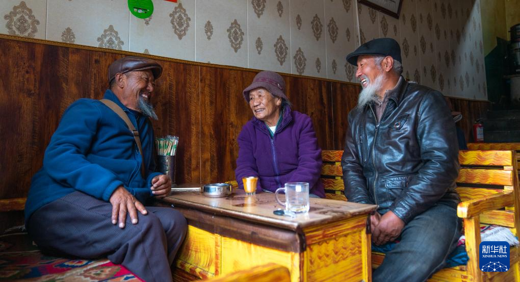 格桑玉珍(中)在茶館里和好友聊天(4月3日攝)。新華社記者 丁增尼達(dá) 攝