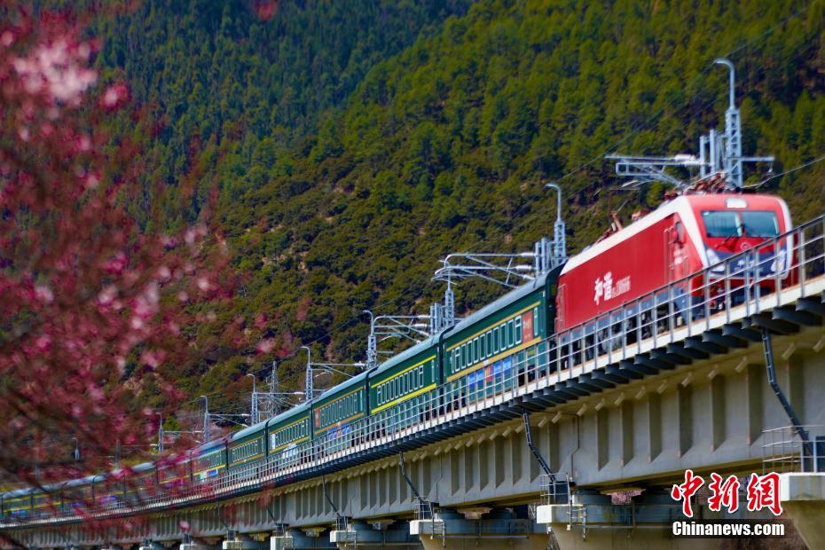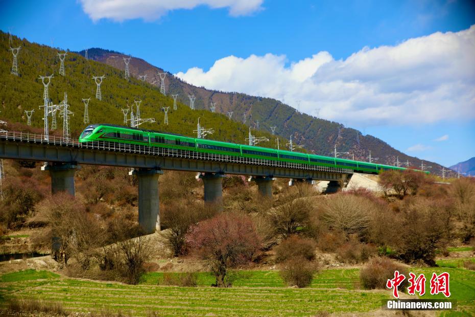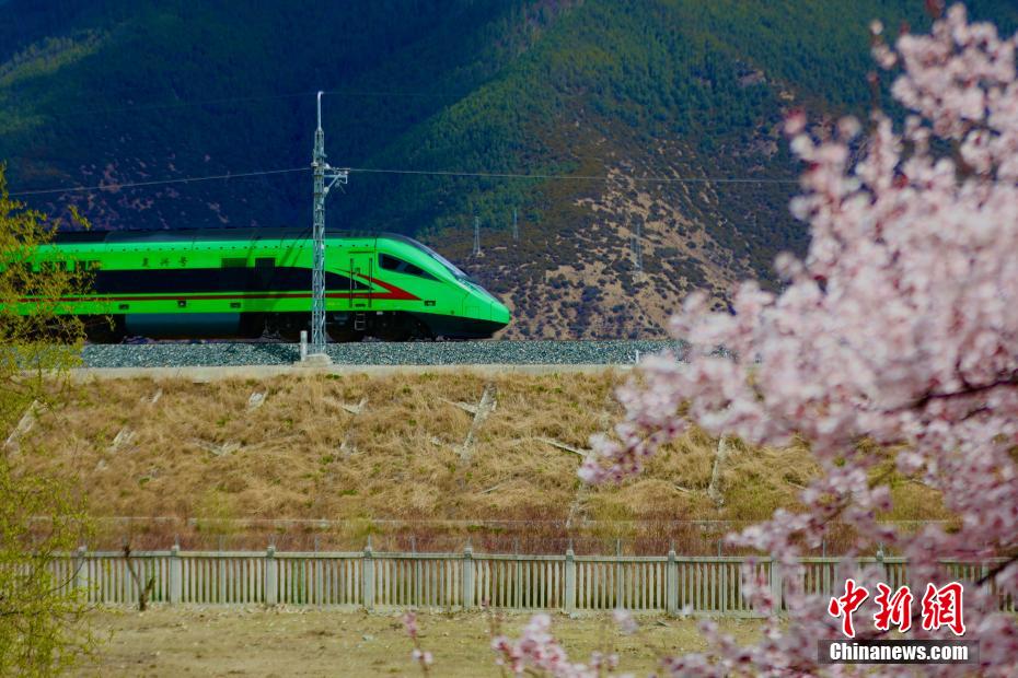 被譽(yù)為新“天路”的拉林鐵路,是中國(guó)首條高原電氣化鐵路,于2021年6月25日開通運(yùn)營(yíng),結(jié)束了西藏東南地區(qū)不通鐵路的歷史。圖為拉林鐵路沿線桃花盛開,與飛馳而過(guò)的動(dòng)車構(gòu)成別樣風(fēng)景圖。