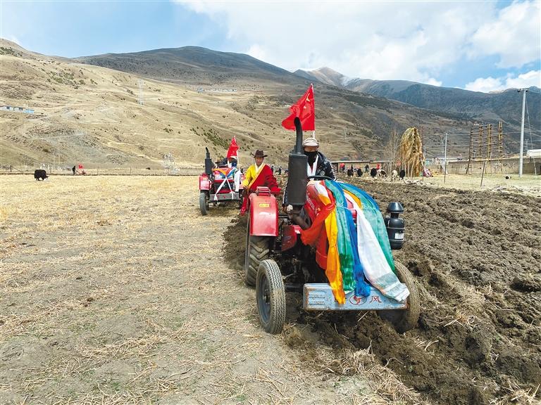 儀式現(xiàn)場(chǎng),農(nóng)牧民群眾身著節(jié)日盛裝,帶著哈達(dá)、酥油茶等聚齊在田間舉行開犁儀式,祈禱全年風(fēng)調(diào)雨順、五谷豐登。懸掛著五星紅旗和黨旗的大型農(nóng)機(jī)具和拖拉機(jī)一字排開,在“轟隆隆”的響聲中,年輕的機(jī)手們開動(dòng)拖拉機(jī)翻耕土地,婦女們熟練地躬身平土,土地逐漸變得平整松軟,一幅生機(jī)勃勃的“春耕畫卷”在加勤鄉(xiāng)的土地上徐徐展開。