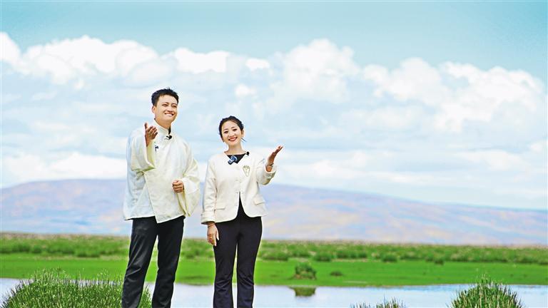 圖為色尼區(qū)文化和旅游局副局長(zhǎng)塔巴曲珍(右)與歌手羅布桑珠錄制宣傳視頻。記者 萬(wàn)靖 攝