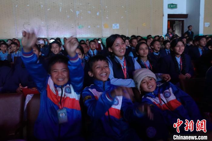 2月20日,中尼跨國新春文藝晚會在尼泊爾博克拉舉行,尼泊爾學生在聽到博克拉國際機場開通首條定期國際航線時歡呼雀躍。 中新社記者 崔楠 攝