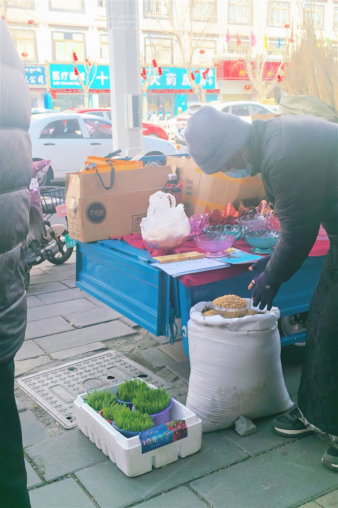 前來采購的格桑卓嘎阿姨,手里提著大包小包,臉上滿是笑意。她買了青稞酒、酥油、風(fēng)干肉還有青稞苗。新年時,用青稞酒祈福,酥油茶招待客人,風(fēng)干牛肉和新鮮軟糯的拉拉、用酥油雕出精美圖案的“推”一起擺盤,供客人隨時食用?!敖衲辍磐弧汀矢隆峭惶?,打算全家圍坐一起吃。家里布置都按習(xí)俗,擺好切瑪、德卡、青稞苗,再給門窗換上新的‘香布’。孩子們買了不少藏文對聯(lián),說是要貼門上,祈福來年順遂。帶孩子來傳統(tǒng)市集,就是要讓他們記住咱們藏歷新年的習(xí)俗。這些年,市集多了些漂亮的藏式手工藝品,不過最有年味兒的,還得是這糌粑和青稞粒的香?!?/p>